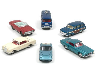miniatures reproduisant les modèles : CHRYSLER IMPERIAL, MERCEDES 220 SE coupé, LOTUS ELAN S2, CHRYSLER GHIA, FORD CONSUL CORTINA break & COMMER 'COUNTY POLICE'