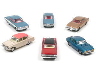 miniatures reproduisant les modèles : RAMBLER MARLIN, BUICK RIVIERA, LANCIA FULVIA SPORT ZAGATO (manques sur les chromes des pare-chocs), OLDSMOBILE SUPER 88, ROVER 2000 & FORD CONSUL CLASSIC (état 'A-')