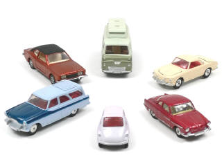 miniatures reproduisant les modèles : NSU SPORT PRINZ, FORD THAMES CARAVAN, VOLKSWAGEN 1500 KARMANN GHIA (petits frottements sur le toit & le capot), FORD CORTINA GXL, HEINKEL 3 roues & FORD ZEPHIR break