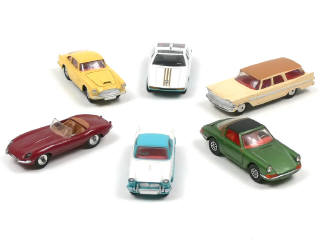 états de 'A' à 'B' - miniatures reproduisant les modèles : JAGUAR TYPE E cabriolet , PLYMOUTH SPORTS SUBURBAN break, ASTON MARTIN DB4, PORSCHE 911S TARGA, TRIUMPH HERALD coupé & DE TOMASO MANGUSTA (antenne cassée)