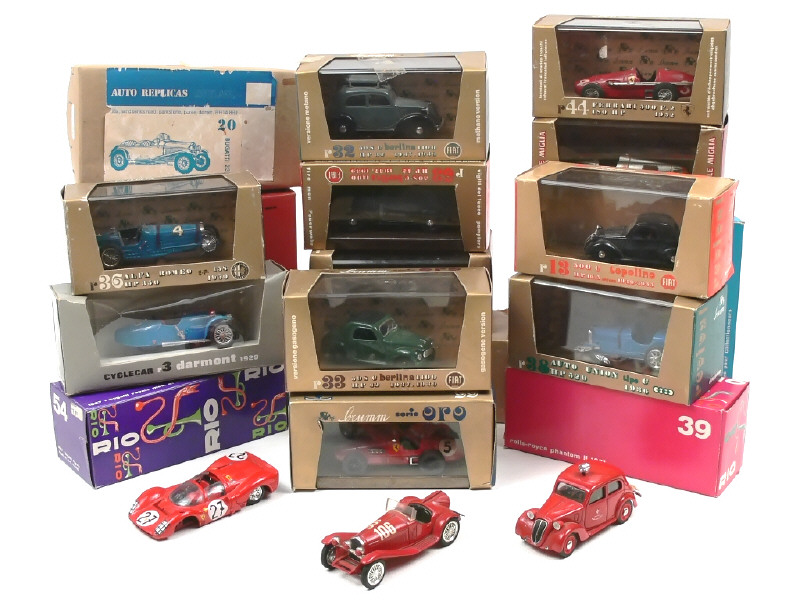 miniatures reproduisant notamment les modèles : BUGATTI, ALFA ROMEO, ROLLS ROYCE, FERRARI, FIAT, DARMONT & MERCEDES - on y retrouve les marques : BRUMM, RIO & BBURAGO - on y joint une MORRIS OXFORD (DINKY TOYS GB) & une BUGATTI en kit brut (AUTOREPLICAS) - petits manques - 7 voitures sans boîte - 2 boîtes en état 'd'