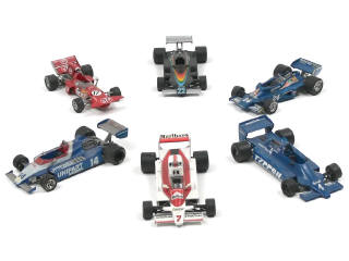 miniatures reproduisant les modèles : ENSIGN (2 exemplaires), MARCH, HESKETH, Mc LAREN & TYRRELL - on y retrouve les marques : TENARIV & FRANCO - quelques petits manques - carrosseries poussiéreuses