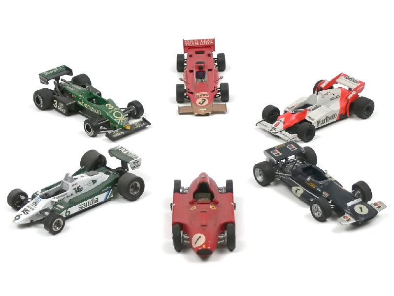 miniatures reproduisant les modèles : TYRRELL, LANCIA, MARCH, LOTUS, Mc LAREN & WILLIAMS - on y retrouve notamment les marques : MERIKITS, WM, FDS & SMTS - carrosseries légèrement poussiéreuses - quelques petits manques