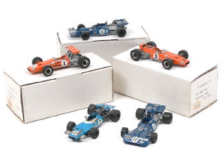 miniatures reproduisant les modèles : MATRA, Mc LAREN (2 exemplaires) & TYRRELL - on y retrouve les marques : TENARIV & SCALE RACING CARS - quelques petits manques & pièces à recoller - carrosseries poussiéreuses - une annotation sur une boîte