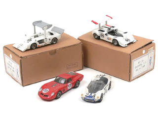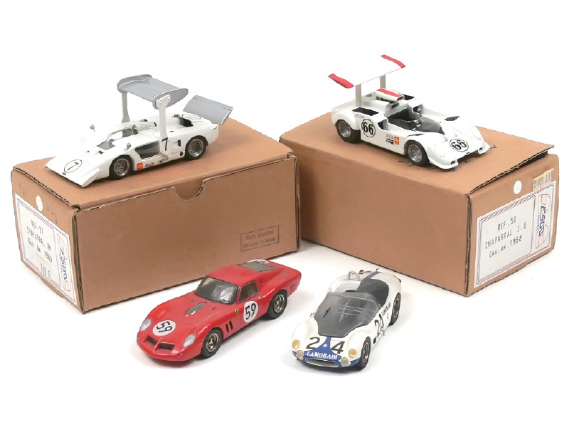miniatures reproduisant les modèles : CHAPARRAL (2 exemplaires en boîte 'b'), FERRARI & MASERATI - on y retrouve les marques : ESDO, BBR & AMR - quelques petits manques - carrosseries légèrement poussiéreuses