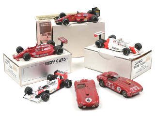 miniatures reproduisant les modèles : LOLA (2 exemplaires), FERRARI (3 exemplaires dont 2 sans boîte) & Mc LAREN - on y retrouve les marques : TAMEO KITS & STARTER - quelques petits manques & pièces à recoller - carrosseries légèrement poussiéreuses