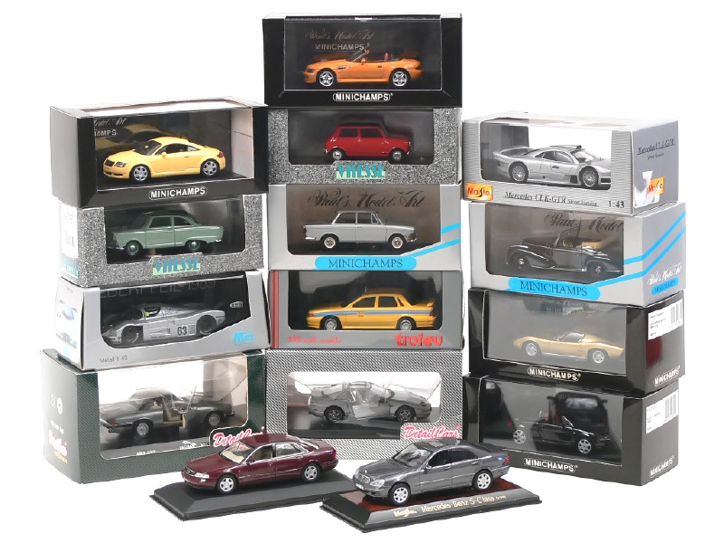 miniatures reproduisant les modèles : AUSTIN, DKW, NISSAN, JAGUAR, MITSUBISHI, MERCEDES, AUDI, LAMBORGHINI & BMW - on y retrouve les marques : MINICHAMPS, DETAILCARS, TROFEU, MAISTO, MODELS MAX & VITESSE