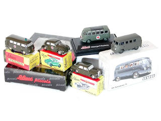 miniatures reproduisant les modèles : VOLSKWAGEN BULLI T1, VOLKSWAGEN COCCINELLE & MERCEDES 180 - on y retrouve les marques : BUB, SCHUCO PICCOLO REPLICA & SCHUCO HO METAL