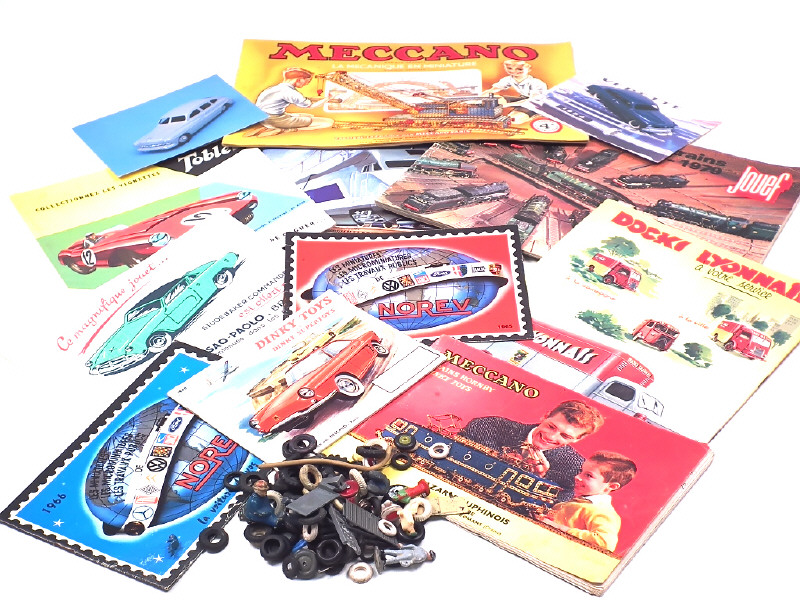 états de 'b' à 'd' - comprend notamment les marques : MECCANO, NOREV, DINKY TOYS & JOUEF - on y joint un ensemble de différentes pièces détachées comprenant notamment pneus, figurines, jantes, etc ...