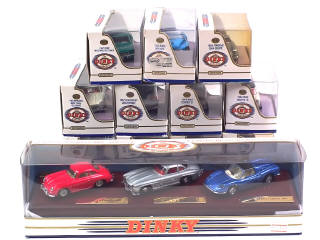 miniatures reproduisant les modèles : BUICK, PORSCHE, FORD, MINI, FERRARI, CITROEN, DELAHAYE, MGB, MERCEDES & CHEVROLET - 3 modèles regroupés dans un coffret - 3 boîtes en état 'c'
