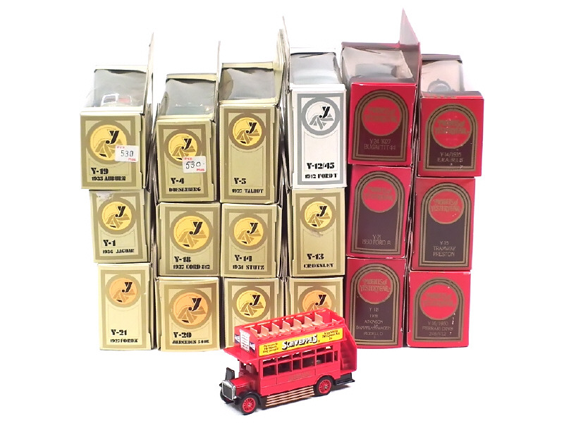 miniatures reproduisant les modèles : CROSSLEY, DUESENBERG, AUBURN, AEC, FORD, MERCEDES, MG, HISPANO SUIZA, ATKINSON, FERRARI, STUTZ, PRESTON, CORD, JAGUAR, TALBOT, E.R.A & BUGGATI - une boîte en état 'c'