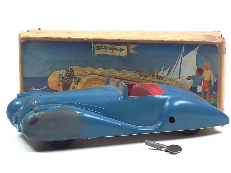 longueur 24,5 cm - avec direction par le volant - moteur à clef (fonctionne, clef présente) - importants manques de peinture à l'avant de la carrosserie - vitre de pare-brise déformée - avec sa rarissime boîte (légèrement tachée)