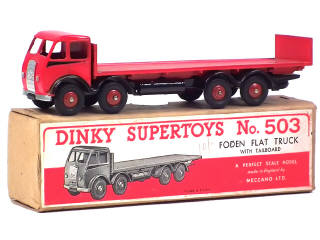 DINKY TOYS (GB) 503 FODEN Plateau à dosseret rouge, châssis & filets noirs