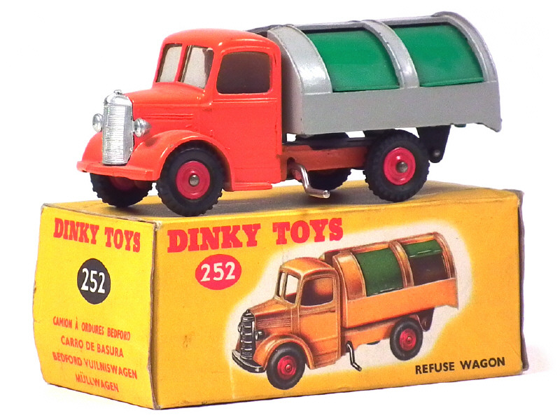 DINKY TOYS (GB) 252 BEDFORD Benne à ordures orange vif, benne grise & verte, jantes rouges