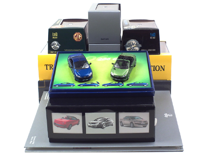 miniatures reproduisant les modèles : VOLKSWAGEN, RENAULT & PEUGEOT - 4 voitures regroupées dans 2 coffrets - on y joint un classeur de la marque, 4 véhicules de la marque UNIVERSAL HOBBIES (MGB,MGF & RENAULT) & une MATRA SBARRO kit monté en résine de marque indéterminée