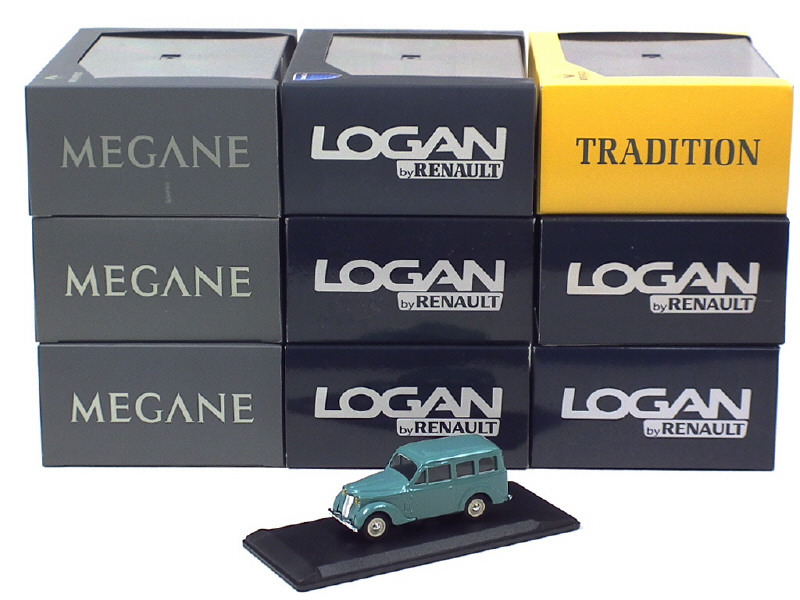 miniatures reproduisant les modèles : LOGAN (5 exemplaires), MEGANE (3 exemplaires), SANDERO, FREGATE, JUVA 4 (2 exemplaires), 4CV, FORD V8 1932 (de la marque ELIGOR) , FORD THUNDERBIRD & MERCEDES-BENZ (de la marque MAISTO)