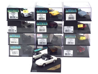 miniatures reproduisant les modèles : ALFA ROMEO (3 exemplaires), CITROEN (2 exemplaires), FERRARI, JAGUAR, LOTUS (2 exemplaires), MITSUBISHI, MORRIS, OPEL & TOYOTA (3 exemplaires)
