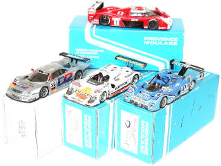 miniatures reproduisant les modèles : FERRARI 333SP 1997, PORSCHE KREMER K8 1997 (un décalque craquelé), MERCEDES AMG 1998 & TOYOTA GT1 1999 - 2 boîtes en état 'c'