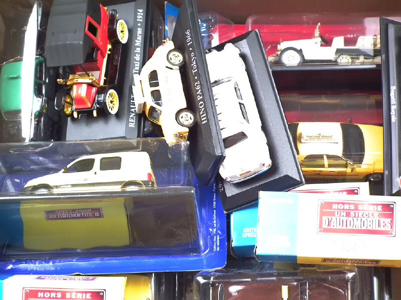vendus en kiosque - miniatures reproduisant notamment les modèles : RENAULT, VOLKSWAGEN, CITROEN, MERCEDES, HINO, VOLVO, BUGATTI & FORD - 4 modèles sans surboîte