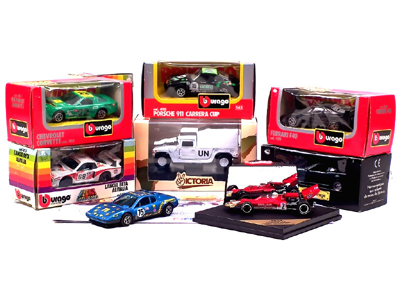 miniatures reproduisant les modèles : FERRARI, LANCIA, PORSCHE, CHEVROLET, HUMMER, ASTON MARTIN & LOTUS - on y retrouve les marques : BBURAGO, VICTORIA & QUARTZO - petits détails de peinture ajoutés - on y joint un catalogue CORGI juillet-decembre 2002