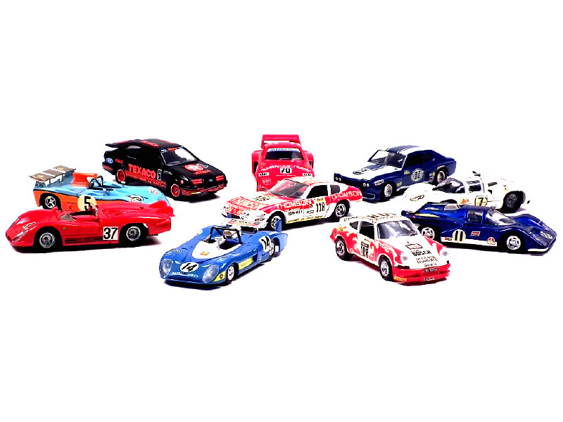miniatures reproduisant les modèles : FORD (2 exemplaires différents, un aileron cassé, quelques décalques incomplets), GULF MIRAGE, FERRARI (2 exemplaires différents), PORSCHE (2 exemplaires différents), MATRA, ALFA ROMEO & CHAPARRAL