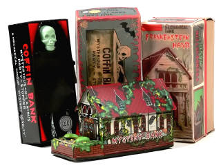 dimensions : 15 x 6 x 9 cm - réalisation en tôle lithographiée - moteur à ressort (fonctionne) - en action, lorsque une pièce de monnaie est déposée sur le perron de la maison, une main de monstre sort & s'en empare