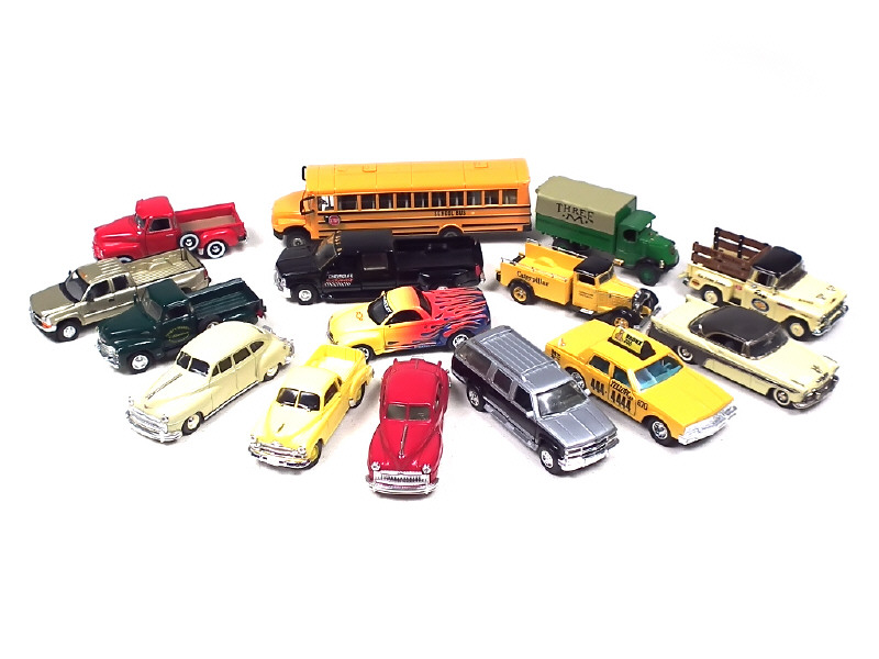 miniatures reproduisant notamment les modèles : DESOTO, CHEVROLET, DIAMOND & MACK - on y retrouve notamment les marques : COLLECTOR'S CLASSIC, ROAD CHAMPS, HONG WELL, ANSON, SIKU, MATCHBOX, SPARK, VEREM, VITESSE & MAJORETTE - quelques petits manques