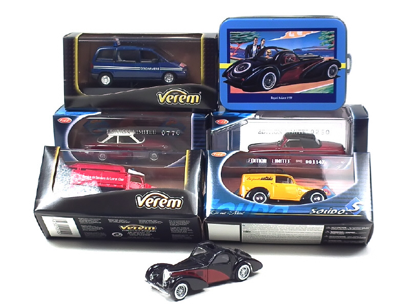 miniatures reproduisant les modèles : RENAULT, PEUGEOT, PANHARD, BUGATTI & HALF TRACK - on y retrouve les marques SOLIDO & VEREM