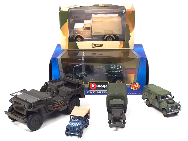 différentes échelles : miniatures reproduisant les modèles : JEEP, LAND ROVER, GMC & OPEL - on y retrouve notamment les marques : BBURAGO (avec boîte), VICTORIA (avec boîte), HONG WELL & SIBUR - petits manques