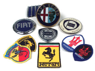 DIVERS (ITALIE) Ensemble de 5 sigles de carrosserie & 5 écussons brodés de constructeurs automobiles