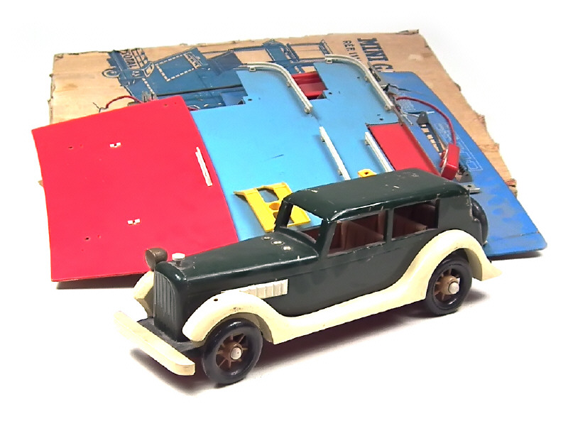 dimensions : 43 x 29,5 x 37,5 cm - éclairage à piles (à revoir) - on y joint une voiture des années 1930 en bois de marque indéterminée en état 'D' - avec manques