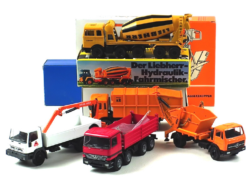 comprend : MAN porteur 4x2 benne à ordures HALLER X2, IVECO 8x2 plateau avec grue ATLAS 140-1 (avec sachet d'accessoire), MERCEDES porteur 4x2 multibenne ATLAS (petites retouches), MERCEDES ACTROS 2631 8x4 benne & MERCEDES tracteur 6x2 bétonnière LIEBHER 1001 (avec sachet d'accessoire, version sans vitres, état 'B')