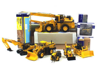 comprend : WA800 chargeuse sur pneus (modèle modifié), WA600 chargeuse sur pneus (modèle modifié), D155AX bulldozer avec cabine, PC450 LC pelle rétro sur chenilles, PC 450 LC pelle démolition sur chenilles, W140 chargeuse pelleteuse (avec notice & sachet d'accessoires), WH613 chariot télescopique & CK25 mini chargeur sur chenilles (boîte 'a') - on y retrouve les marques : JOAL, UNIVERSAL HOBBIES & FIRST GEAR