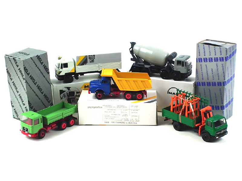 comprend : MAN porteur 6x4 benne carrière, MAN F90 porteur 4x2 plateau bâché, MAN F90 porteur 8x4 bétonnière (avec sachets d'accessoires, 2 garde-boue ternis), MAN porteur 6x4 benne basculante & MERCEDES porteur 4x2 miroitier 'EHEGLA' (état 'B')