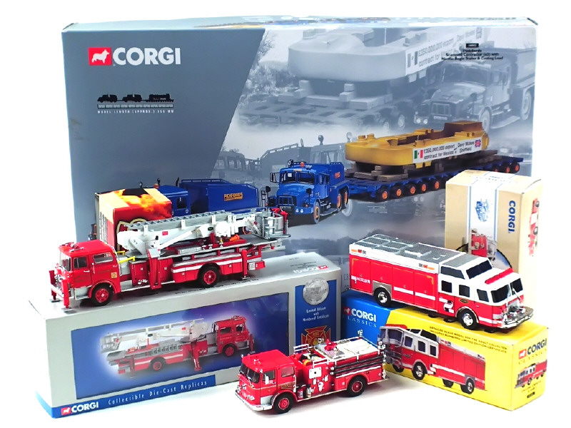 comprend : CYCLONE II RESCUE E-1 (avec certificat d'édition limitée numéroté 1637/6200 exemplaires & un sachet d'accessoires), AMERICAN LA FRANCE 'CITY OF ORLANDO' (avec certificat d'édition limitée numéroté 1463/8000 exemplaires & petit catalogue), MACK grande échelle (avec sachet d'accessoires) & SEAGREVE K 'BALTIMORE COUNTY' (sans boîte, avec petit dépliant présentant les différents modèles de la marque)