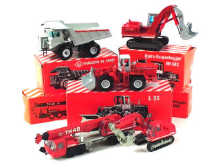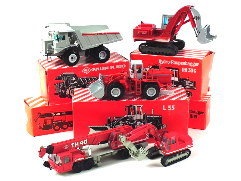 comprend : TH40 grue télescopique sur porteur 8x4 (état 'B'), RH30C pelle chargeuse sur chenilles (boîte en état 'c'), L55 chargeuse sur pneus, RH9 pelle rétro sur chenilles & FAUN K100 dumper - on y retrouve les marques : CONRAD, NZG & GAMA