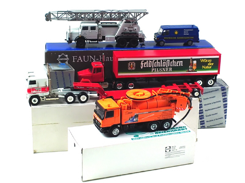 comprend : FAUN LK W porteur 8x2 avec mât de forage (certificat d'édition limitée numéroté à 2600 exemplaires), MAN TGA porteur 6x4 citerne curage d'égout 'WEIDEMANN & REICHARD' (avec sachet d'accessoires), 2 FREIGHTLINER tracteurs 6x4 semi-remorques un porte-engins 'DALLAS & MAVIS' (boîte 'c') & un autre container 'PILSNER' (avec sachets d'accessoires) & MERCEDES BENZ 307 fourgon long 'MESSER GRIESHEIM'