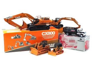 comprend : CASE CX800 pelle rétro sur chenilles, 650 H bulldozer (sans boîte), 1850K bulldozer (sans boîte), CASE POCLAIN 1188 pelle rétro sur chenilles & INTERNATIONAL 4900 plateau à ridelles 'CASE' - on y retrouve les marques : CONRAD, FIRST GEAR & ERTL