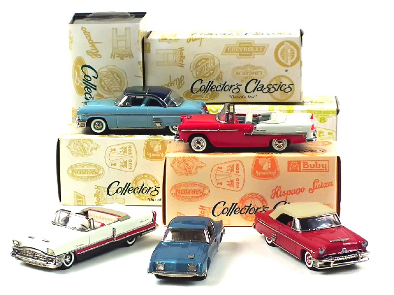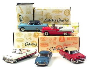 miniatures reproduisant les marques : CHEVROLET, MERCURY (2 exemplaires différents), PACKARD & STUDEBAKER