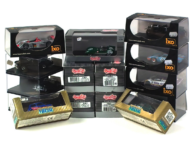 miniatures reproduisant les modèles : ASTON MARTIN, JAGUAR, LOTUS, MORGAN, AUSTIN, MORRIS COOPER, FORD, AUDI & BENTLEY- on y retrouve les marques : QUARTZO, VITESSE & IXO - petits manques - une boîte en 'c'