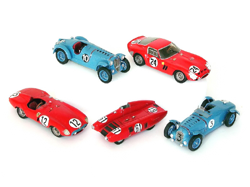 miniatures reproduisant les modèles : DELAHAYE 135S 1938, DELAHAYE 175 1949, FERRARI 750 MONZA 1955, NARDI BISILURO 1955 & FERRARI 250GTO 1963 - on y retrouve les marques : STARTER, PROVENCE MOULAGE & MANOU