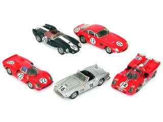 miniatures reproduisant les modèles : 330 LMB, P2, TESTAROSSA 1958, 250 CALIFORNIA 1959 & 512S 1970 - on y retrouve les marques : STARTER, GAMMA & DAM