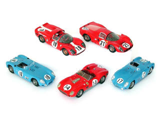 miniatures reproduisant les modèles : FERRARI P2, FERRARI P3 (petits manques sur les décalques), TALBOT MASERATI 1956 (n° 14 & 18) & FERRARI 60TR 1959 - on y retrouve les marques : STARTER & AUTOMANY