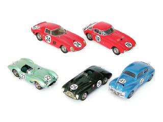 miniatures reproduisant les modèles : PEUGEOT 203 CONSTANTIN 1952, ASTON MARTIN DB3 1952, FERRARI 375 1954, ASTON MARTIN DB3S 1955 (petits manques sur les décalques) & FERRARI 250 GT 1964 - on y retrouve les marques : STARTER, PROVENCE MOULAGE & AUTOMANY