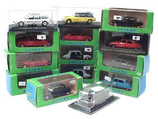 comprend notamment : 21 'RALLYE MONTE CARLO', 'POMPIERS VILLE DE LYON', 'ADMINISTRATION', 'CLUB DU LEMAN', 'POLICE PARISIENNE', 'ASSISTANCE CAR BELGIUM' (de la marque RIO), 'CROIX ROUGE FRANCAISE AUTIN' (de marque indéterminée) & 19 (de la marque DEL PRADO) - 2 modèles en état 'B' & 4 boîtes en état 'c'