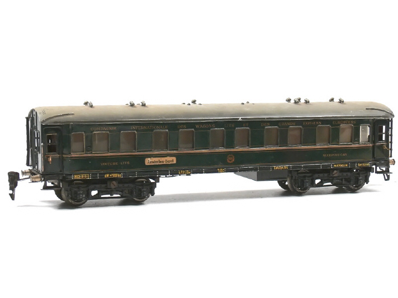 fabrication de 1935 à 1948 - avec plaque latérales de trajet 'AMSTERDAM -BASEL', toit ouvrant, 4 portières ouvrantes, aménagement intérieur en tôle peinte & vitrage - avec étiquette d'origine de graissage collée sous le châssis - petites traces d'oxydation sur les parties nickelées & de métal fatigue sur 6 roues - manque 9 aérateurs de toit