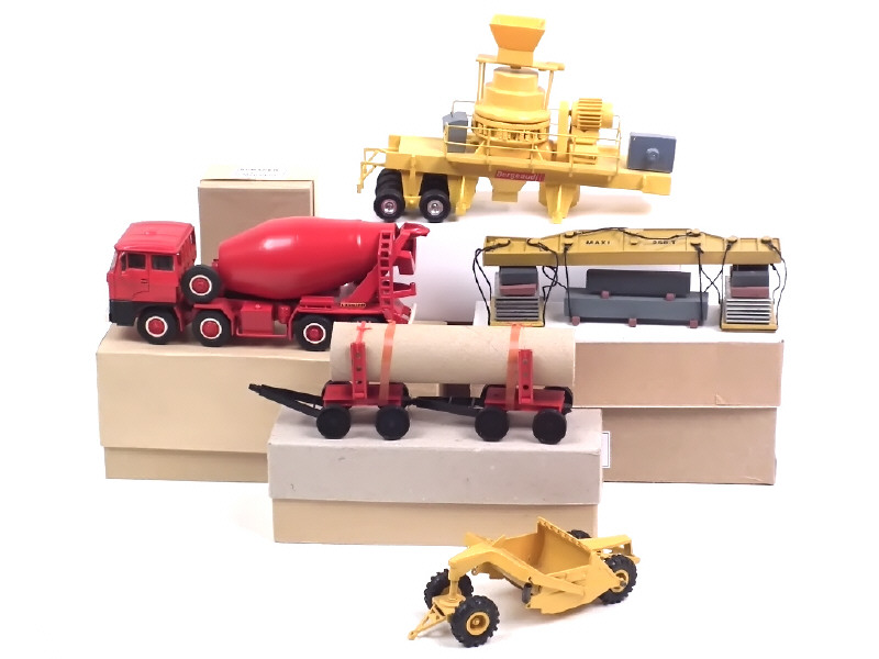modèles uniques - réalisation artisanale - comprend : BERGEAU concasseur JIRASDIC mobile, DAF 8x4 porte-bétonnière LIEBHERR (cabine à recoller), scraper tracté & potence essais de charge 250T - on y joint un chariot porte-bois de la marque ATM