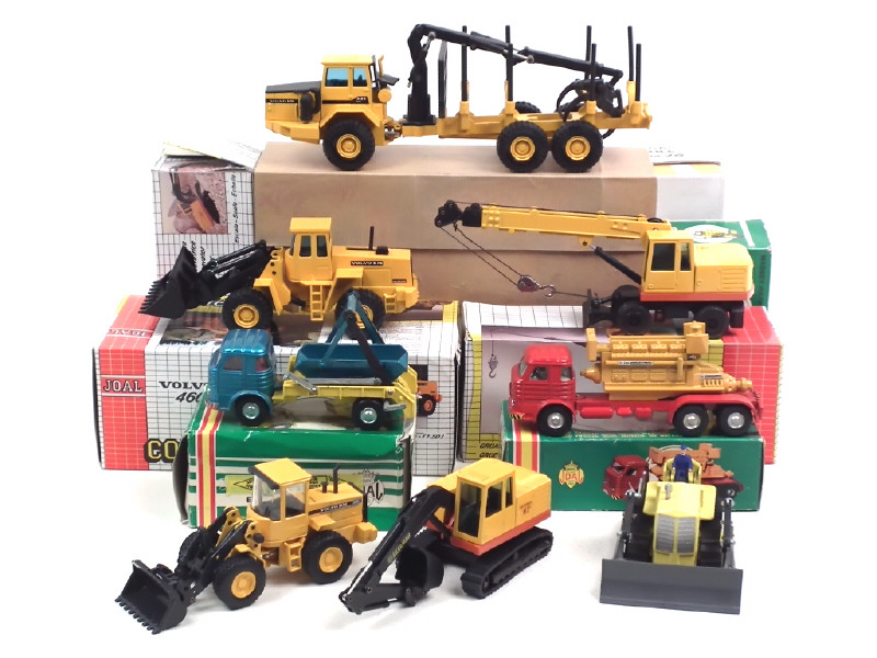 comprend : VOLVO (BM L70C chargeuse sur pneus (sans boîte), 4600B chargeuse sur pneus & BA35 6x6 porte-bois avec grue (sans boîte), AKERMAN (H7C pelle rétro sur chenille (sans boîte) & grue télescopique sur roues (avec lame ramblais, roues modifiées, sans boîte), MASSEY HARRIS bulldozer, PEGASO (multibenne & porteur 6x4 avec moteur de bateau CATERPILLAR)