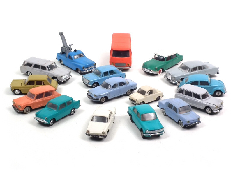 états de 'B' à 'C' - miniatures reproduisant les modèles : SIMCA (2 exemplaires différents), FORD (2 exemplaires différents), CITROEN (3 exemplaires différents), RENAULT (2 exemplaires différents), PEUGEOT (2 exemplaires différents), MERCEDES, VESPA, PANHARD, MORRIS & VOLKSWAGEN- avec manques & parties cassées - certaines carrosseries encrassées, décolorées & légèrement déformées - quelques retouches