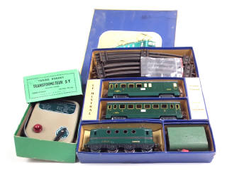 contient : motrice électrique BB-8051, voiture de voyageurs de 2ème classe, voiture mixte de première classe, 12 rails courbes (état 'C' avec traces d'oxydation), un transformateur n°0 (état 'C') & une petite étiquette 'GRAISSAGE OBLGATOIRE' - on y joint un transformateur type S.T. (état (A.b) - ensemble non testé - boîtes tachées